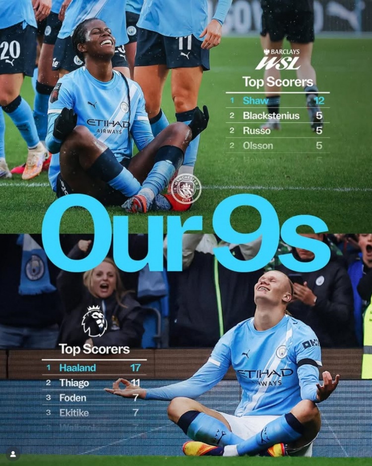 目前在联赛中,曼城男女足前锋均领跑射手榜。