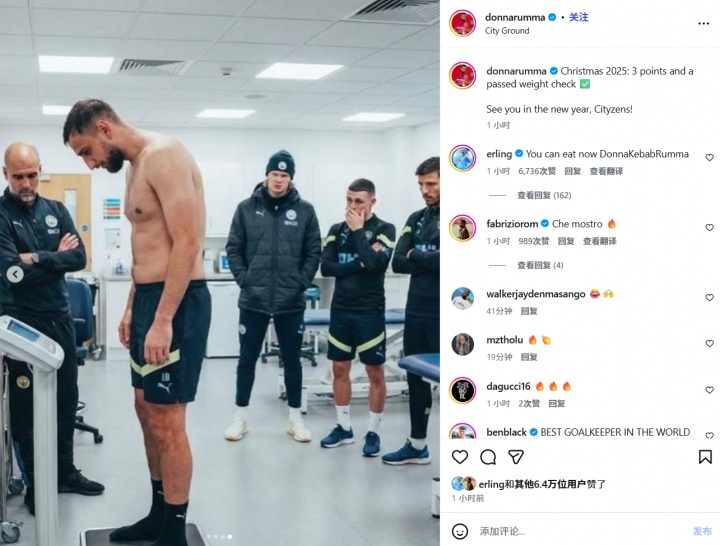 12月28日讯 英超第18轮曼城2-1战胜森林,赛后多纳鲁马社媒晒出队内体重检测照片,并庆祝胜利。
