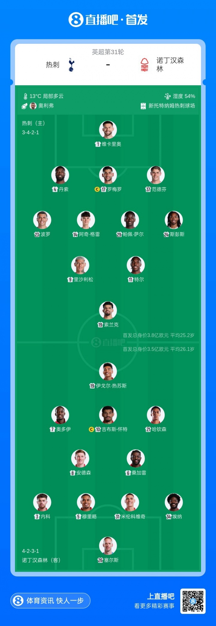 保级大战!热刺vs森林首发:范德芬、特尔、里沙利松、索兰克先发
